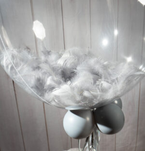 This chic silvery grey bubble balloon is a stylish gift or party decoration for any occasion, including weddings, anniversaries, birthdays, Valentine’s Day and more. Our 20″ clear outer balloon is filled with silver feathers, and on the outside we add your personalised message, with a choice of colours and fonts available. To finish the look, we add four small balloons to the base, along with matching ribbons and a weight. On average, our balloons have a float time of 7 – 10 days.