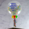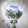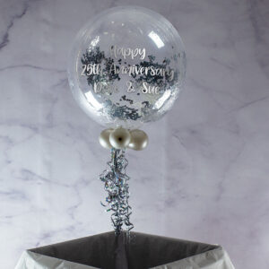 Add some silvery style to your next party or celebration with this Personalised Silver ‘Powderfetti’ Bubble Balloon. Featuring a series of customisation options, add your very own message, fonts, colour to really make this gesture your own. To make this decoration we inflate a 20″ outer balloon and fill it with small square biodegradable confetti. We then add finishing flourishes such as ribbon, mini balloons and a weight to keep your balloon anchored in its box. Lasting 7 – 10 days on average, this bubble balloon arrives boxed, inflated and ready to open.