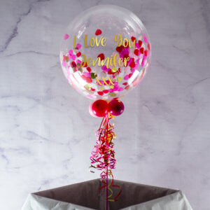 This stunning bubble balloon is the perfect gift for Valentine’s Day, filled with small heart-shaped confetti in various shades of red and pink. You can add your own personal message on the outside, so if you want to make your special someone feel loved, this is the way to do it. Around the bottom of the balloon we add four smaller balloons, matching ribbons and a weight. Lasting 7 – 10 days on average, it’s a gift that keeps on giving.