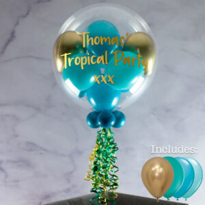 Add some warm shades to a summer party or special occasion with our Personalised Tropical Teal Balloon-Filled Bubble Balloon. Filled with gold, deep teal and light teal mini balloons, this stunning decoration can be customised with your own wording to create a truly unique gift for anyone to enjoy. The perfect addition to any Hawaiian-luau party, fiesta or palm tree themed celebration. To create this decoration we inflate a 20″ outer balloon, printed with your own wording, font and other customisation options, before filling it with a selection of luxurious mini tropical-inspired balloons. To finish off the look we add coloured ribbon and a weight to match! Lasting 7 – 10 days on average, this bubble balloon arrives in a box, inflated and ready to open.