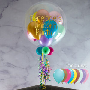 Throw a magical or fantasy themed party with our Personalised Unicorn Balloon-Filled Bubble Balloon. Made with a clear outer balloon and filled with nine mini balloons in bright rainbow colours. This enchanting decoration can be uniquely customised with a name or message! The balloon will last 7 – 10 days on average and will be sent inflated and packaged in a box to a special recipient of your choice!