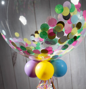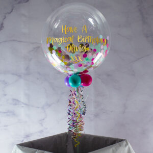A beautiful eye-catching bubble balloon filled with unicorn-inspired confetti! On the outside we can add your own personal wording for any occasion, with a choice of fonts and colours. The 20″ balloon is filled with unicorn colour confetti and the look is finished with four small balloons at the base, along with matching ribbons and a weight. On average these balloons last 7 – 10 days.