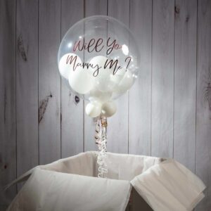We like to call this one ‘Serene Dream’! Our beautiful white balloon-filled bubble balloon is a lovely gift for weddings, anniversaries and other special occasions. Inflated and ready to give to the recipient, we’re sure they’ll love it. Inside the clear 20″ outer balloon we inflate several white smaller balloons, while on the outside we can your personal message, with a choice of fonts and colours. We finish it with four small balloons to the base, along with matching ribbons and a weight. Add a gift message at the checkout for that extra special touch.