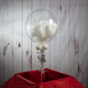 Send your other half an unforgettable gift on Valentine’s Day with this beautiful white heart balloon-filled bubble balloon, personalised with your own special message. Make a lovely statement or propose to them in a special way when this balloon pops out the box. Our 20″ clear outer balloon is inflated, then filled with smaller white heart-shaped balloons. On the outside you can add your message, with a choice of colours and fonts. We finish the look with smaller balloons around the base, matching ribbons and a weight. Lasting 7 – 10 days on average, this bubble balloon arrives boxed, inflated and ready to open.