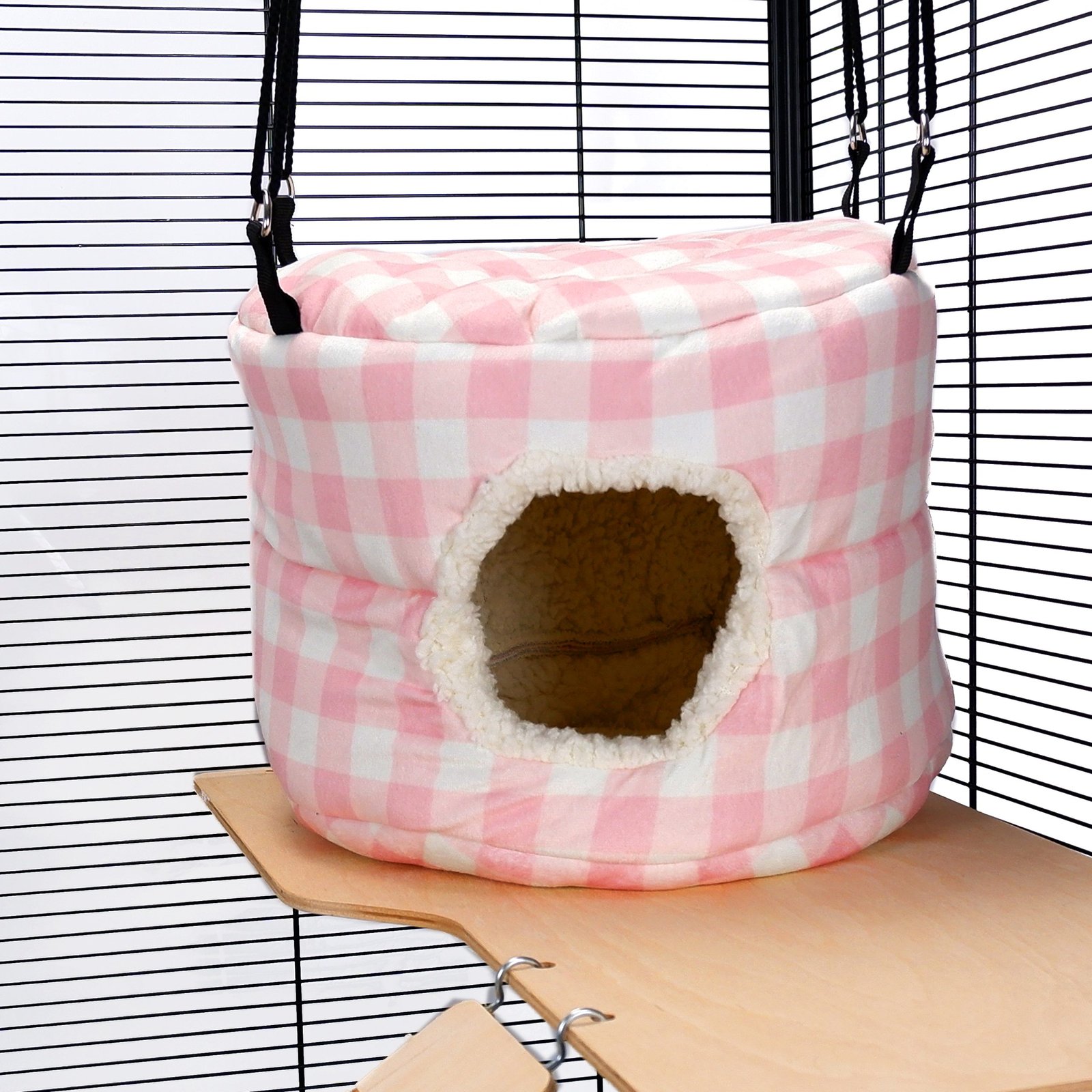 The Pet Rat Ferret Chinchilla HUGE Rodent-Hive Toy in Pink Gingham from Little Friends is a spacious, versatile hideaway designed for small pets. This semi-rigid toy can be used freestanding or hung from the cage top using the included clips. With its generous dimensions, it provides an engaging and comfortable space for multiple small animals to play and rest.
