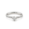A delightful ladies platinum ring perfect for an engagement ring. The round brilliant cut centre stone is .30ct F /VVS quality and sits in four corner claws. The shank of the ring tapers ever so slightly and has round diamonds in a micro claw setting these diamonds are .14ct in total. This ring is a small finger size and a one off