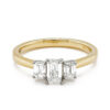 A stunning three stone ring set in all platinum which is set with diamonds on the shoulders. The all platinum setting leads up to a three round brilliant cut setting. The central diamond is the largest diamond which is .80cts and G colour. The diamonds which flank the central diamond are round brilliant cut and are set in a platinum claw setting. The ring is delicately finished with diamonds on the shoulders