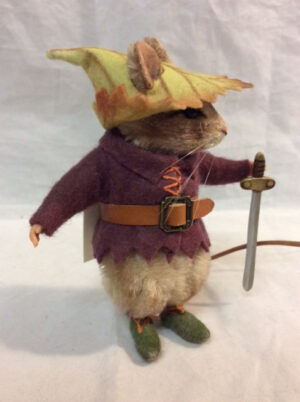 His period costume is completely crafted from the finest wool felt, including his hand shaded and embossed leaf hat, making you believe, that is what is actually upon his head. His collared and long-sleeved raggedy edged tunic is fastened with orange twill, matching the ties of his hand shaded peasant shoes, whilst his decorative brass buckle is custom-cast, adding charm to his leather belt. To finish, he fiercely holds his wooden sword, that has been handcrafted and painted at the RJW studio.