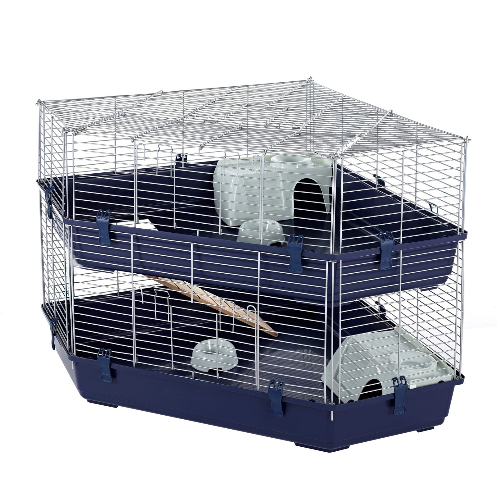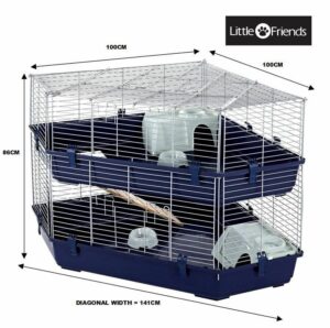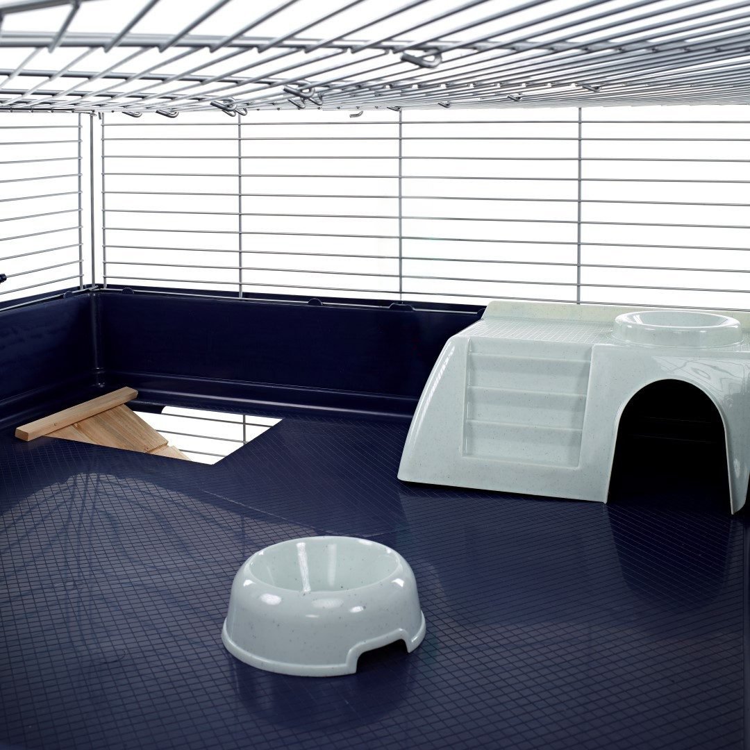 The Little Friends Indoor Double Corner Cage offers a spacious, stylish, and secure home for rabbits and guinea pigs. This two-level cage is designed to fit neatly into corners, providing ample room for exploring, playing, and relaxing. It features a wooden ramp connecting both levels, secure bar spacing for safety, and a modern dark blue base with silver bars that add an elegant touch to any home. The cage comes flat-packed with assembly instructions.