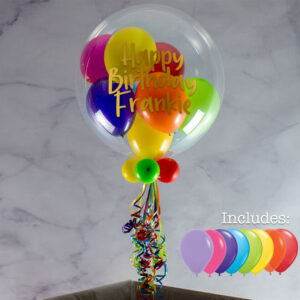 Bright, colourful and cheery, our rainbow balloon package is a great way to decorate any party venue. Perfect for kids birthdays or wishing someone well, but equally at home in any big event, this package consists of multi coloured balloons in various shapes and sizes. Our package includes: 1 x rainbow filled personalised inflated bubble balloon, 2 x multi coloured circle inflated foil balloon bunches, 10 x inflated small multi coloured scatter balloons, Our foil balloons have a float time of 7-10 days, please ensure they are kept in a room temperature environment as helium balloons can appear to deflate in colder temperatures. Please note, our packages will arrive in 2 separate boxes.