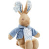 The Peter Rabbit Comfort Blanket is 35cmD x 35cmW x 12cmH and features the head and arms of Peter in the middle. He has been sewn from a gloriously baby soft nutmeg hued plush, with sweet embroidered, facial features and a white and blue print for his upright inner ears. His paws have bean-filled tips for that added, satisfactory, sensory feel. At his neck is a blue collar, leading down to the blue top-side of the soother, with a super-soft white underside. To finish two detailed embroidered tags. One features a known image of Peter, the other a capital P for his name. Great for snuggling, developing little hands to grab and finger-tip discovery.