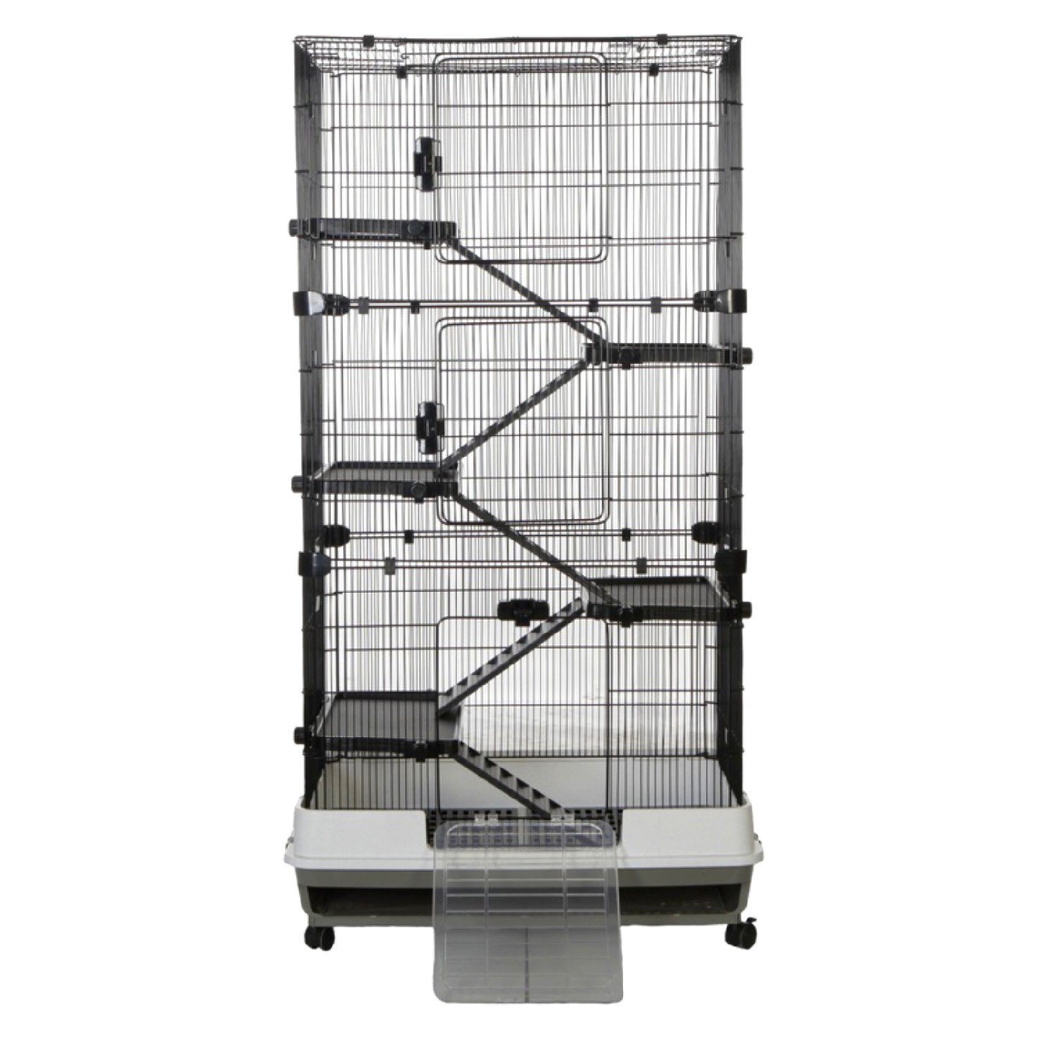 The Little Friends Chatsworth 5-Level Cage is a spacious and secure habitat designed for rats, ferrets, chinchillas, and other small animals who love to climb and explore. This tall 152cm cage features five levels with shelves and ladders, allowing for a customisable layout to suit your pet's needs. The large fold-down front door provides easy access for cleaning and interaction, while the narrow 1.1cm bar spacing ensures safety and ventilation.