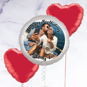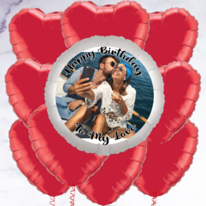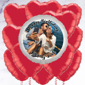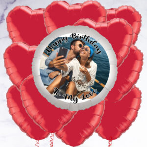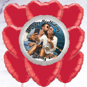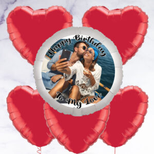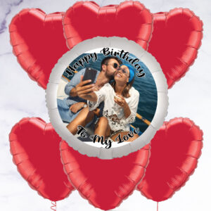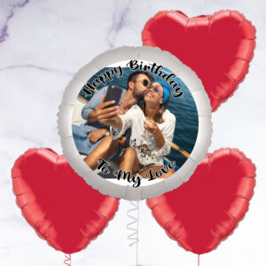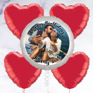 Our personalised photo balloon is the perfect gift for a special occasion such as an anniversary or Valentine’s Day, with the option to add red heart foil balloons to make a beautiful bunch. Please note that the additional red heart balloons will need to be added in the next step of the process, otherwise the order is for a single printed balloon. Arriving inflated, you can add a photo of your choice to the balloon, as well as a personalised message. Photo balloon is 23″ in diameter, Heart foil balloons are 18″ in diameter, Balloons arrived inflated with a weight, Float time: Approx 10 – 14 days, Note: If you order 4 or more balloons, your order may arrive in multiple boxes, How It Works Upload your image. Choose an image that’s as big as possible – this will allow you to choose the right part of your image to feature on the balloon., Use your mouse (computer) or finger (mobile/tablet) to move the balloon over your image in the preview above. Use the arrows to zoom in and out until you’re happy with your selection., Add your text – we can add one line of text at the top and one line of text at the bottom, or you can choose to have no text at all., Use the ‘Click here to see a preview’ button to see what your finished balloon will look like., On the next stage you can choose to add between 1 – 11 foil balloons to create a bunch.,