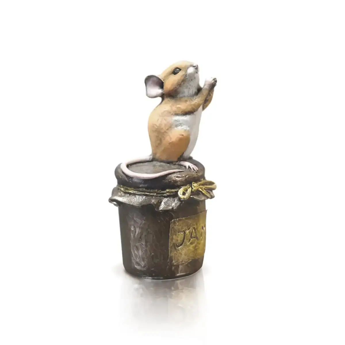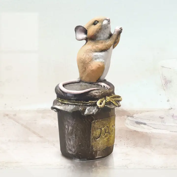 “Please Sir, may I have some more?” This adorable little mouse seems determined to get a taste of the delicious home-made jam sealed tightly inside the pot. Standing on tiny feet, begging and gazing up with the sweetest expression, it’s almost impossible to resist such a charming plea. Expertly sculpted by Michael Simpson, who is renowned for capturing the endearing character of these tiny creatures, the piece is cast in resin bronze and carefully hand-painted in artists’ oils to bring out every delightful detail. Measuring 9.3 cm high, 4.6 cm long and 4.6 cm deep, this whimsical sculpture is beautifully presented in a branded box, making it a thoughtful and memorable gift.