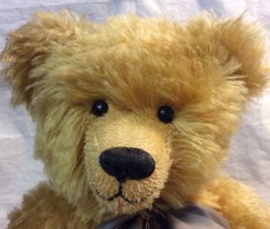 Bearalia is a 46 cm / 18", fully jointed teddy bear. She has been sewn from a luxuriously soft and dense, semi-fluffy blonde mid-pile mohair and tactile, light-beige suede paws with her right sole featuring a facsimile of the Robin Rive logo and her signature, whilst glossy black eyes with a hand stitched black nose upon her carefully trimmed muzzle, brings the charm. To finish, a sumptuous, satin bow with added ribbon trim.
