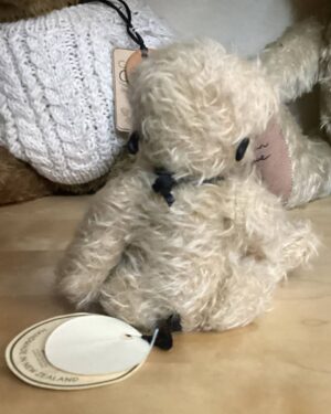 Tobias is a Limited Edition Mohair Robin Rive bear. He is five-way jointed, made of a light golden mohair, which is shortened around the face, and he has two black safety eyes and a sewn black nose and mouth. The bear stands at approximately 18cm tall, and has brown felt paws, with the left foot paw featuring the Robin Rive logo.