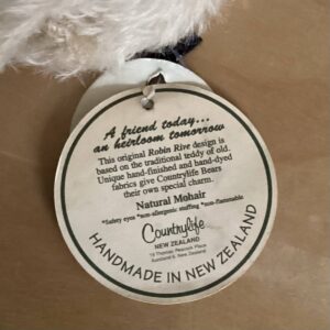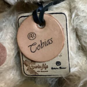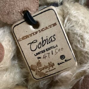 He will come to you with his hang tags, including his original Robin Rive tags, a name tag, and his certificate tag featuring his limited edition number. Tobias is number 47 of 500.