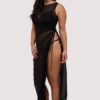 Whether it’s a sexy night in or a big night out – make a statement with Saffi! The sleeveless ‘Saffi Ruched Mesh Bodycon Dress’ features a bateau neckline and is crafted from sensuously sheer black mesh, cut sexily to cling to your hips and fall loosely to the ankle. A deep split runs up each side, which is adjustable and can be lengthened or shortened by ruching ribbon ties.