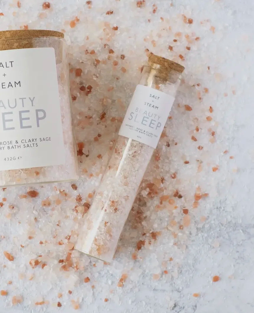 Salt and Steam Beauty Sleep Bath Salts with Lavender, Rose & Clary Sage offer a calming blend of Epsom and Himalayan salts for a relaxing bedtime experience.