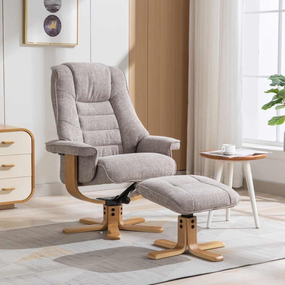 This soft fabric recliner chair offers luxury and comfort at an unbeatable price. The Sardinia is a versatile and stylish addition to any home. Its fresh look and range of fabrics & leathers make it a perfect fit for any décor. The Sardinia also boasts an easy recline mechanism and 360° swivel, providing ultimate comfort from head to toe, and with its mid oak star base, this chair adds a touch of sophistication to any room. Colour Availability as of 30/03 Chacha Oat Low stock Chacha Dove In stock Chacha Fern Early May Chacha Ocean Late April Griege In stock Hessian In stock Soft, easy clean fabric. Great support. Incredible value. Incredible value fabric recliner Made with natural soft and easy clean fabrics 6 wonderful fabrics, plus another variant with real leather on all contact areas Plenty of width and height, plus excellent lumbar support Adjusting knob allows you to fix ideal reclining position Large, shaped feet Comes with well padded sloping footstool Generous dimensions. Full-body comfort. Sturdy construction. The Sardinia’s large seat and high back offer full-body comfort, and the wood laminate feet serve as a sturdy base. 360-degree swivelling. True rotational freedom. Take it for a spin. This chair swivels a full 360 degrees, giving you complete flexibility. Features Star spindle base Steel frame Manual recline Supports up to 18 stone Medium assembly required