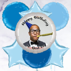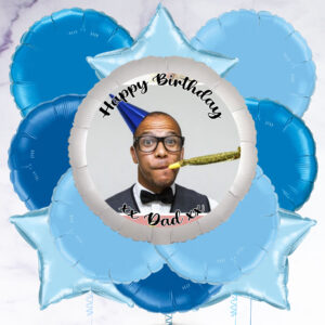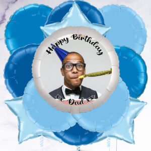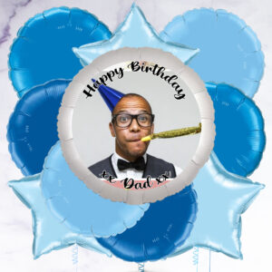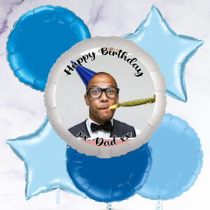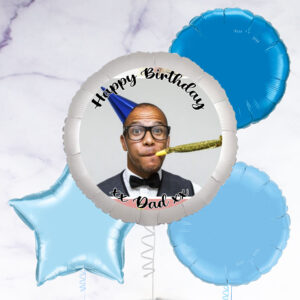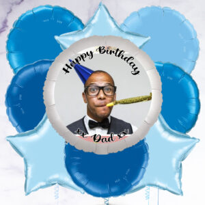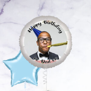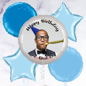 Our personalised photo balloon is the perfect gift for a special occasion such as a birthday or Father’s Day, with the option to add a selection of blue foil balloons to make a great bunch. Arriving inflated, you can add a photo of your choice to the balloon, as well as a personalised message. Photo balloon is 23″ in diameter, Foil balloons are 18″ – 20″ in diameter, Balloons arrived inflated with a weight, Float time: Approx 10 – 14 days, Note: If you order 4 or more balloons, your order may arrive in multiple boxes, How It Works Upload your image. Choose an image that’s as big as possible – this will allow you to choose the right part of your image to feature on the balloon., Use your mouse (computer) or finger (mobile/tablet) to move the balloon over your image in the preview above. Use the arrows to zoom in and out until you’re happy with your selection., Add your text – we can add one line of text at the top and one line of text at the bottom, or you can choose to have no text at all., Use the ‘Click here to see a preview’ button to see what your finished balloon will look like., On the next stage you can choose to add between 1 – 11 foil balloons to create a bunch.,
