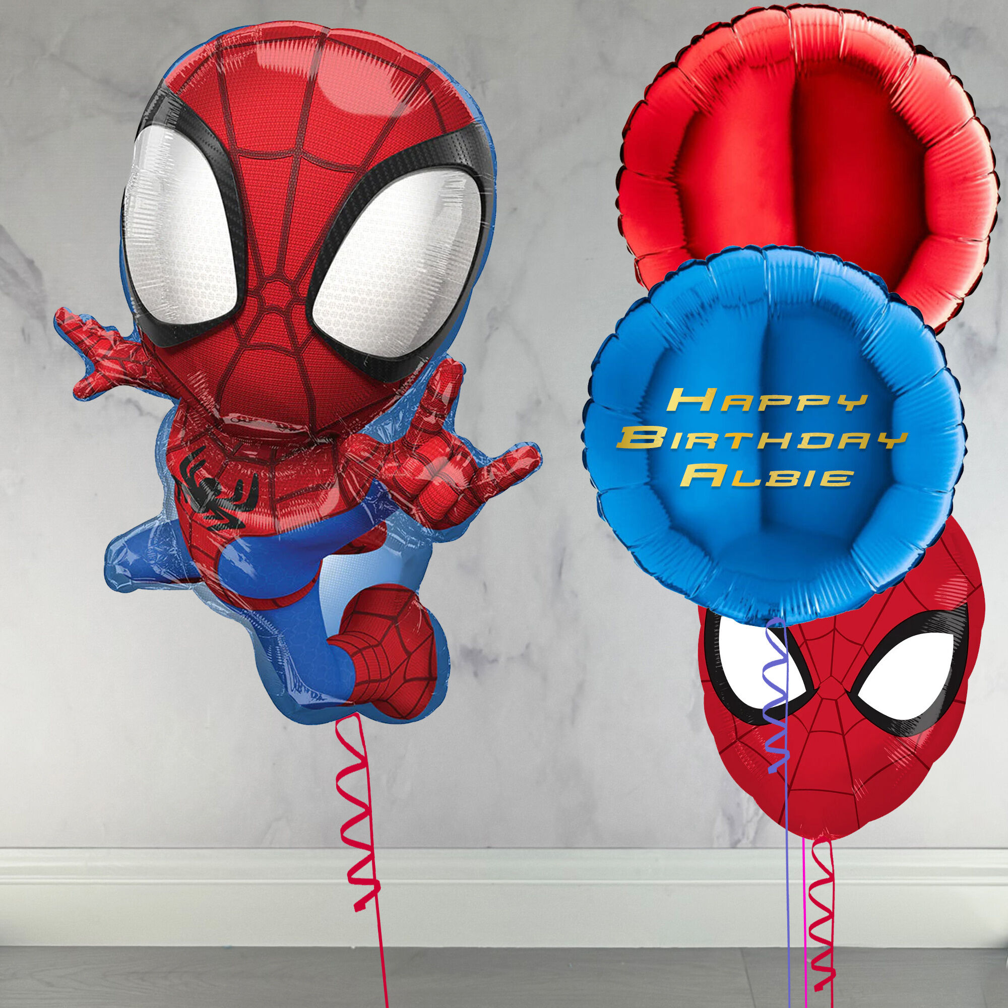 Official licensed Spiderman & his amazing friends balloon set. Arriving inflated, on matching ribbons and weights and delivered on a date of your choice. Featuring a larger 29″ web slinging Spiderman foil alongside a set of 3 x 18″ foil balloons; a Spiderman face and 2 plain foils, one of which is personalised in a matching font. Keep stored in a warm space away from heat sources, sharp objects and inquisitive pets for a float time of 7-10 days!