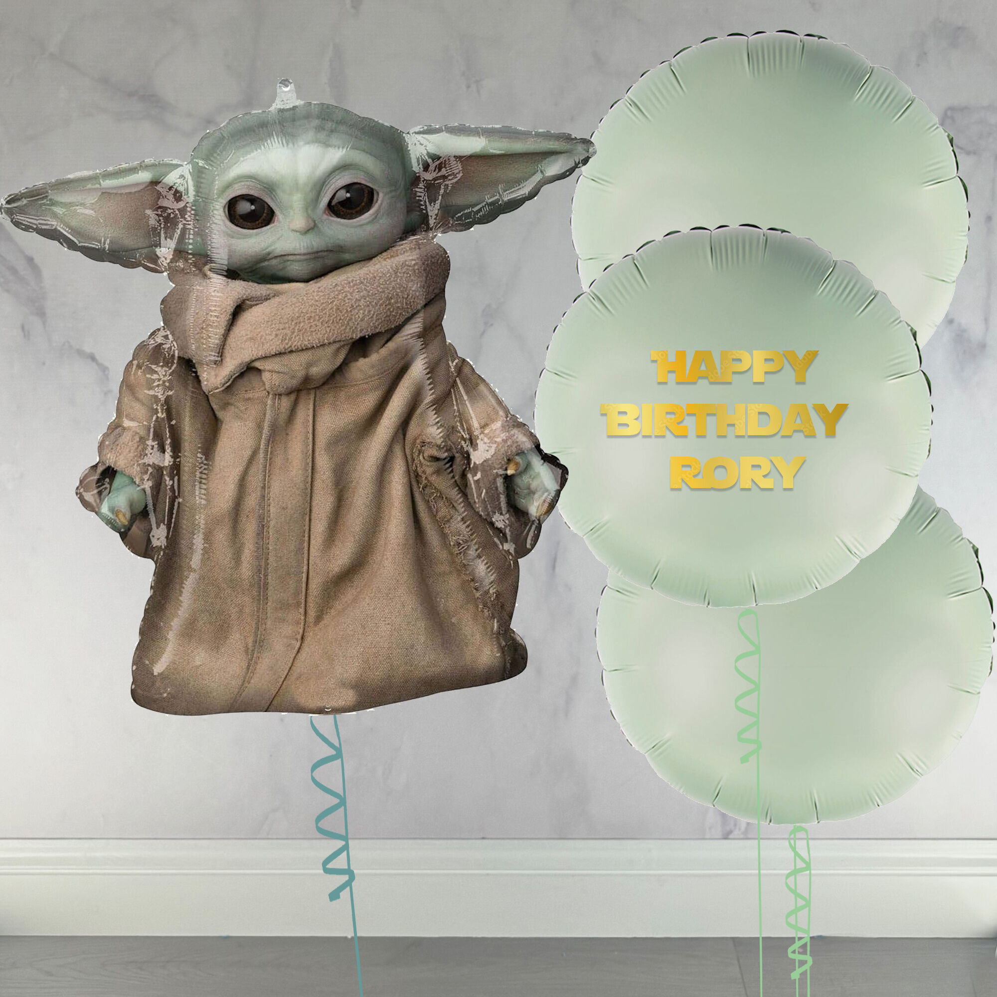 Official licensed Star Wars Mandalorian inflated and personalised balloon set. This set arrives with a large ‘The Child’ 26″ balloon alongside a set of 3 x 18″ foils in a matching green colour, one of which is personalised in a matching font in a colour of your choice. These balloons arrive inflated, on matching ribbons and weights, ready to use straight from the box. With a float time of 7-10 days you will need to keep them in a warm, room temperature space away from heat sources, sharp objects and inquisitive pets.