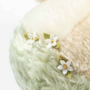 Spring is an 18 cm / 7", character bunny, with a turn able head and moveable arms. She has been sewn from the finest, luxury mohair in pale apricot and white for bunny herself and a frosted green for her grassy lower half, decorated with delicately leaved, wool felt daisies. She has glossy black safety eyes, enhanced with black wool felt for that more endearing look and hand stitched features that have received minimal, hand shading bring appeal. With smooth inner ears, a sheer, apricot organza ribbon bow and a mirroring leaved daisy upon her head, she is the epitome of springtime.
