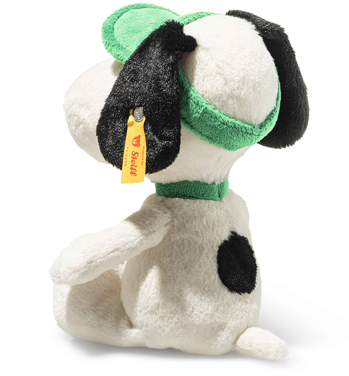 Steiff are happy to bring to you – Snoopy, the world-famous beagle from the Peanuts comic strip, takes to the court as a tennis pro and wins hearts with his unmistakable charm. Measuring 22 cm tall, this delightful Steiff creation is made from cuddly-soft white plush, with embroidered eyes that capture his signature expression. Bean bags in his bottom and feet help him sit securely, whether on display or ready for play. His lovingly designed tennis outfit — complete with a plush green sun visor and a tennis racquet — is perfectly complemented by his classic green collar. Finished with the iconic Steiff “Button in Ear,” Snoopy brings a joyful sporting spirit both on and off the court and remains a lifelong cuddle companion.