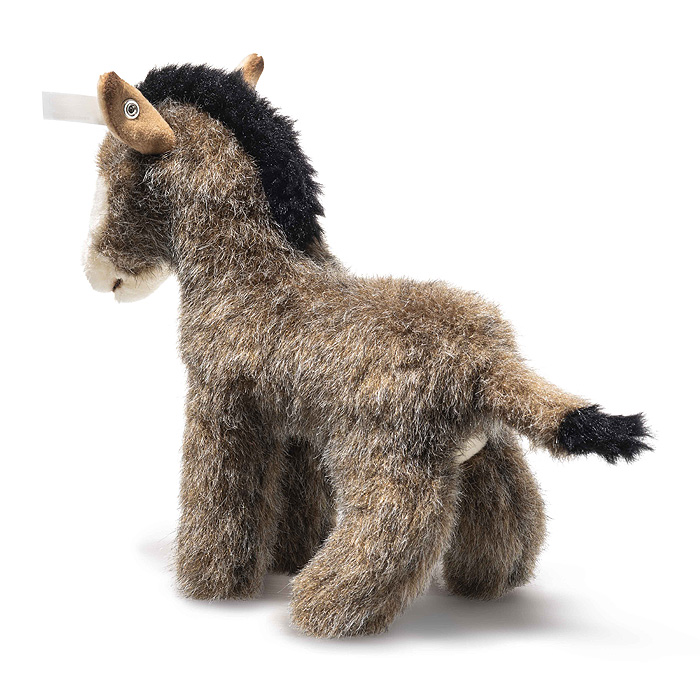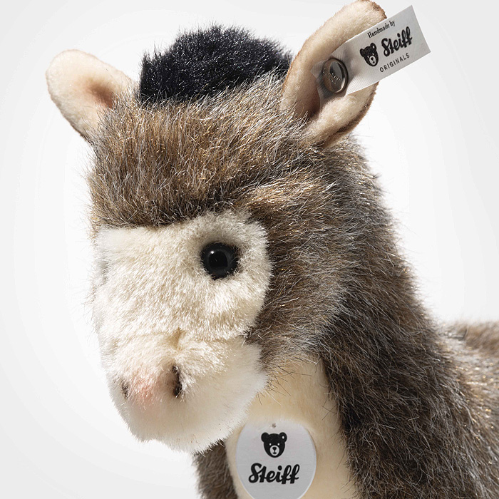 Asinus Donkey by Steiff has a calm presence and a gentle, thoughtful gaze that instantly soothes the heart. Crafted from especially soft brown plush, he features a deep black mane that contrasts beautifully with the light beige accents on his face and ears, creating a warm and natural look. Subtle airbrushing enhances his expression, adding lifelike depth and a touch of realism to his sweet features. Measuring 17 cm, he proudly wears the iconic Steiff “Button in Ear,” a treasured symbol of loving craftsmanship and enduring quality. This peaceful little companion radiates serenity, inviting cozy cuddles and quiet moments of comfort—a truly delightful plush donkey for Steiff fans and little animal lovers alike.