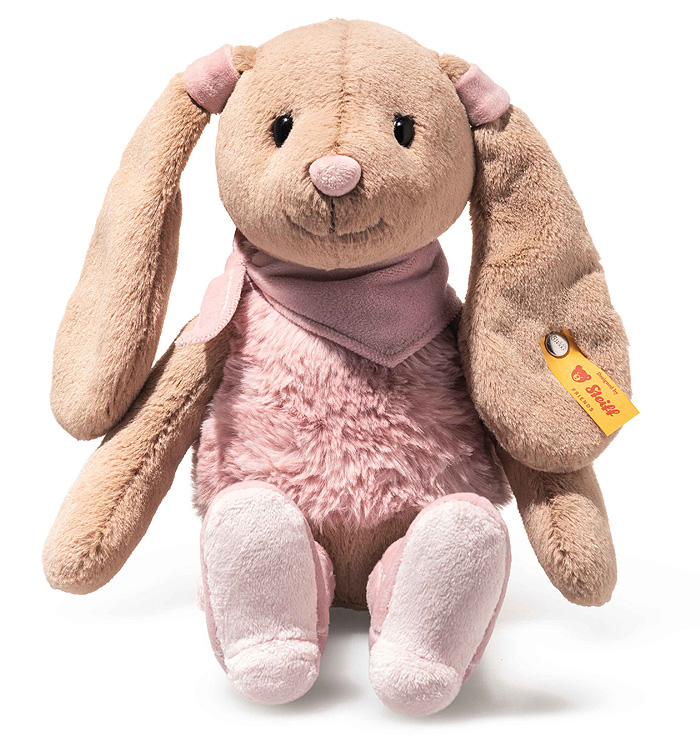 As the prairie sky glows at sunset, Hoppie Cowgirl Rabbit from Steiff is already setting off on her next adventure. Measuring 32 cm, she is made from snuggly soft plush, fluffy pink for her body and the rest of her is super soft caramel coloured plush, she sits steadily thanks to the little bean bags tucked into her bottom, always ready to pause for a cuddle and show off those pink cowgirl boot. Her gentle eyes and sweet little nose make her simply irresistible, while delicate star embroidery on her cowgirl boots adds a charming touch of frontier spirit. And, of course, the iconic Steiff “Button in Ear” rides along with her on every journey through the Wild West.
