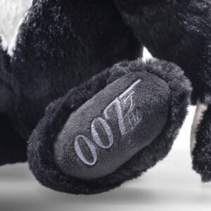 James Bond is a fully jointed character teddy bear. He has been sewn from the finest quality blonde and black plush with a small black satin bow tie, to give the impression that he is wearing a tuxedo and tie. He has velvety soft beige plush palms and black plush soles of his feet, his left sole features the recognisable 007 logo embroidered in silver coloured thread. He has shiny black safety eyes with a smart hand stitch nose and mouth upon his trimmed muzzle.