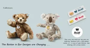 This is the Steiff 3 way jointed (arms and head) mohair Snoopy created to commemorate Snoopy's 50th anniversary. His feet are flat so he is posed standing and his eyes, eyebrows, mouth and claws are embroidered. He is wearing a cotton green hat and red cotton scarf.