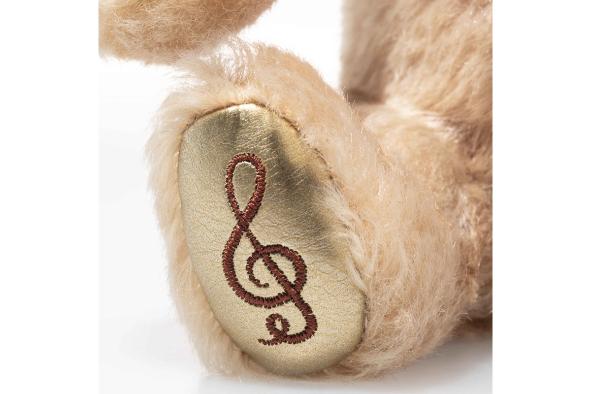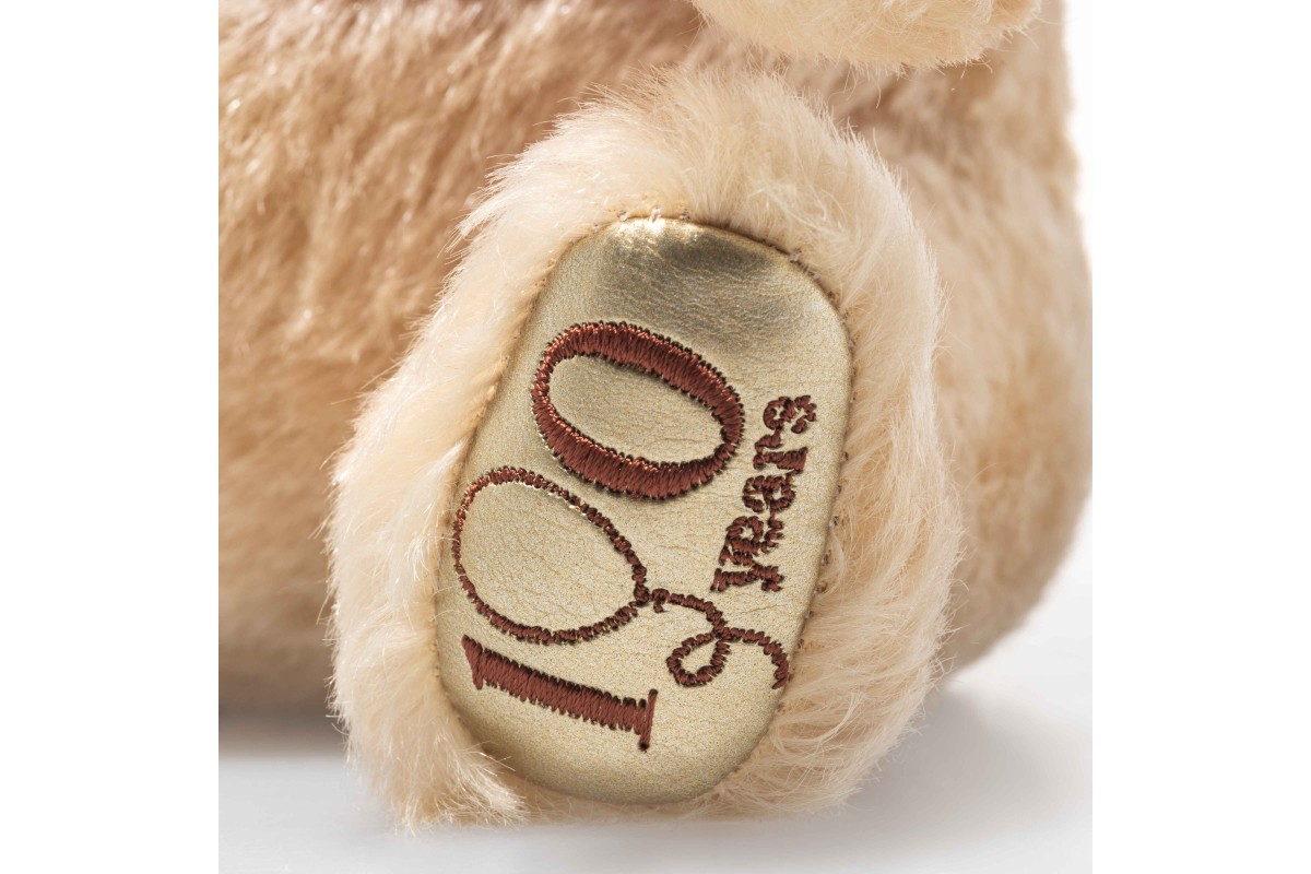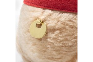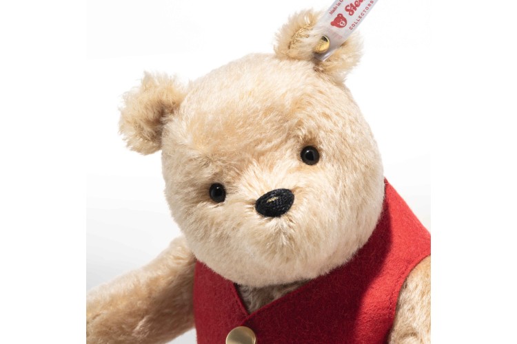 This amazing 20cm sitting Winnie the Pooh is 3 way jointed (head and arms), made using the finest light blonde mohair and he wears a red felt waistcoat with a single gold button. The soles of his feet are made from artificial golden leather with "100 years" embroidered on the left foot and a musical note on the other which depicts the fact that he is a musical bear, the turn key on his back plays the Winnie the Pooh song.