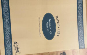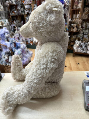 1908 is a sizeable 65 cm (25.5") fully jointed teddy bear, with a wonderful tip and tilt growl. He has been sewn from the finest, luxuriously dense and wavy, winter-white mohair, with warm wool felt paws and lovingly stuffed with excelsior, just like the original. He has glossy, two-tone brown, glass eyes with a smart, chocolate stitched nose and mouth. With his distinctive cupped ears, hump back, overly long arms and sizeable feet, along with the charm and endearment he holds within, he is not to be missed.