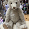 1921 is a sizeable 70 cm / 27.5" fully jointed teddy bear, with a tip and tilt growler. He has been sewn from a luxuriously dense and curly, white mohair with warm wool felt paws and stuffed with excelsior. Unlike the original though, he has forgone his boot button eyes, for sparkling, two-tone brown glass and features a light-chestnut hand stitched nose, mouth and claws. This nod to tradition albeit, his size brings charm and personality, becoming the focus of any room or collection.