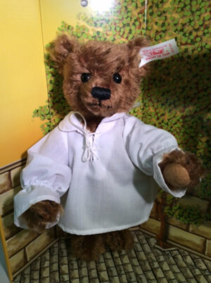 Romeo is a 9 " / 22cm, fully jointed teddy bear. He has been sewn from a luxuriously wavy, chestnut mohair, with paler hued, wool felt paws. He has glossy black eyes with a matching hand stitched black nose, whilst a white cotton shirt, in a period design completes his look.