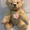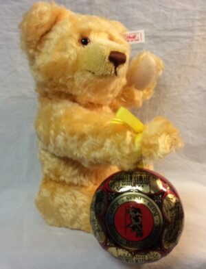 Kaas Beer is a 30 cm / 12 " fully jointed teddy bear, with a warm tip and tilt growler. He has been sewn from the finest, luxury mohair in a wavy rich yellow, with warm wool felt paws. He has glossy two-tone brown eyes, with a hand stitched chestnut nose and mouth, upon his carefully trimmed snout, resulting in quite the character, whilst attached to his wrist by a yellow satin ribbon, is an original, round Dutch cheese box (tin), featuring traditional red, black and gold imagery and decals of the time.