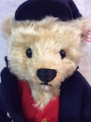 James is a 23 cm / 9.5 ", fully jointed character teddy bear. He has been sewn from a luxurious and dense, wavy blonde mohair with warm, wool felt paws. He has the most friendly, 'full of hope' expression, thanks to his glossy black eyes and hand stitched, black nose, whilst his tailored attire consists of a navy blue wool felt coat decorated with a trio of silver-coloured buttons and matching cap, plus a contrasting red wool felt waistcoat, complete with four gold-coloured buttons. In his left paw he holds the American flag, showing his allegiance to his new world and in his right, a simple burlap sack, wrapped around his few worldly possessions.