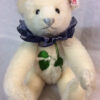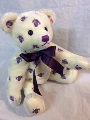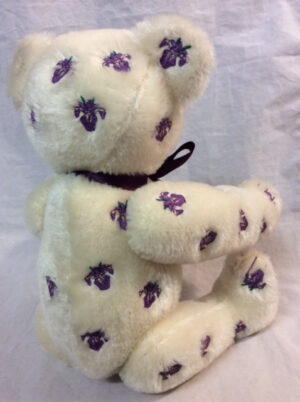 Iris is a 33 cm / 13.2" fully jointed, teddy bear with a tip and tilt growl. She has been sewn from a luxurious, short-pile white mohair, with matching warm, wool felt paws, glossy black safety eyes, outlined in purple and a hand stitched, inverted pentagon nose, sewn from purple thread. Embroidered throughout her coat and even on one of her of her paws and inner ears, are detailed purple iris' in all their glory, topped off with a deep purple, satin ribbon bow. She is stunning to behold and enchanting to look at.