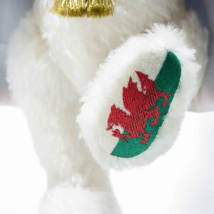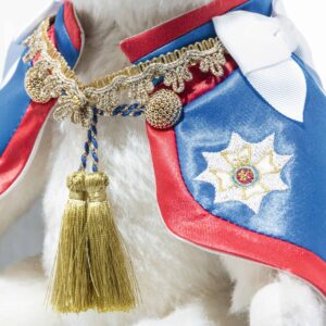 She is wearing a blue and red robe with gold trim and tassels. Her paw is embroidered with the Welsh flag and she has a crest embroidered in gold and white on her robe.