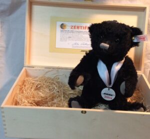 Bose is a fully jointed and traditionally designed teddy bear. He has been sewn from the finest, luxury glossy black mohair with tactile grey suede palms and soles. His low hung ears and glimmering black eyes, outlined in grey, rise above his expertly trimmed muzzle, which is home to his hand stitched, grey thread nose and mouth, giving an endearing expression. Around his neck is a sumptuous, silver satin ribbon and a ceramic, round pendant advertising Bose and the year 2004.