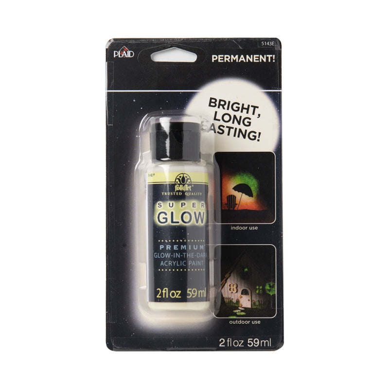 Super Glow Folkart (carded) 2oz from World of Craft. FolkArt Super GLOW 2 oz. Carded – Yellow. FolkArt Super Glow is a permanent, water-based, glow-in-the-dark paint that performs well after being charged with exposure to bright light. Once applied to a porous surface and charged, FolkArt Super Glow will glow over and over after each recharge. It is the perfect, permanent glow-in-the dark paint to use when crafting for special occasions and holidays, as well as the current fairy garden trend. Great for parties or Halloween.