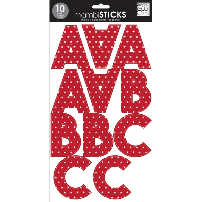 Tara Red Stars from World of Craft. Me & My Big Ideas Sticks Tara Alphabet Stickers really know how to make a statement!. Letters are Tara san serif font in Red with White stars. Size is approximately 2 7/8 inch. Acid-free and lignin-free. Over 110 stickers with uppercase letters and numbers.