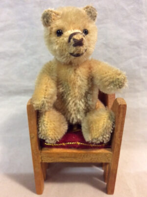Theodore is the same size as his original counterpart, 8.5 cm / 3.5" and fully jointed. He has been sewn from a gold, short-pile mohair and lovingly stuffed with wood shavings and daintily shaded to give the impression of age and 'worn' areas. He has glossy black eyes above his off-centre cocoa stitched nose (just like the original), with the impression of a longer muzzle, due to the thread semi circles above and below (smile), but it's enough to bring that warm, friendly endearment.