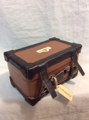 He comes in a bespoke, handmade leather trunk that features the Teddy Bears of Witney logo, corner and edge protectors, straps, buckles and sturdy handle. The detail continues inside, with a cotton lining and pocket. It fits his wooden chair, complete with T initial embroidered cushion and Theodore himself.