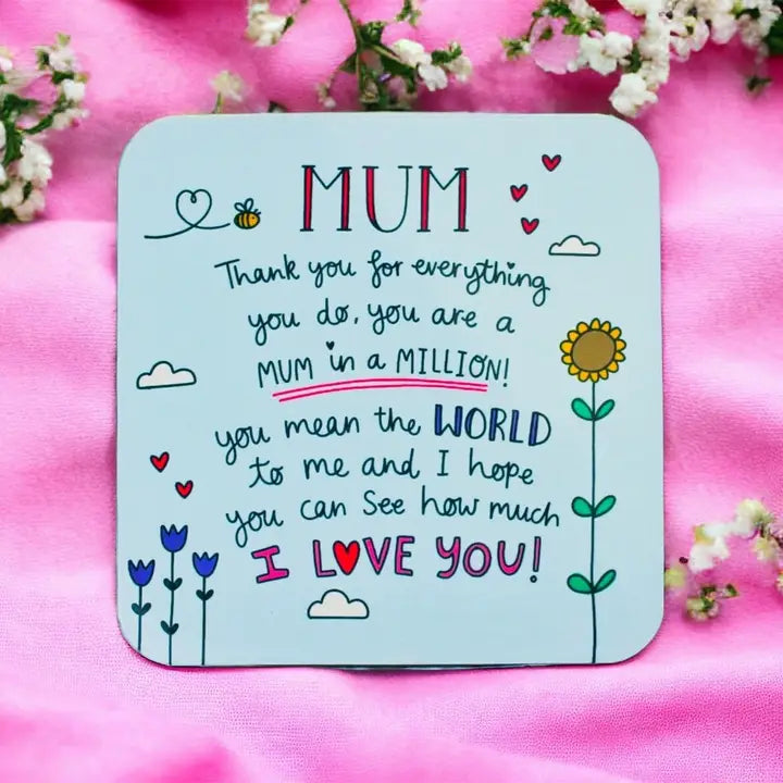 Thank You Mum Coaster, a perfect gift to show appreciation with cute illustrations and a heartfelt quote. A durable and meaningful gesture for your mum.