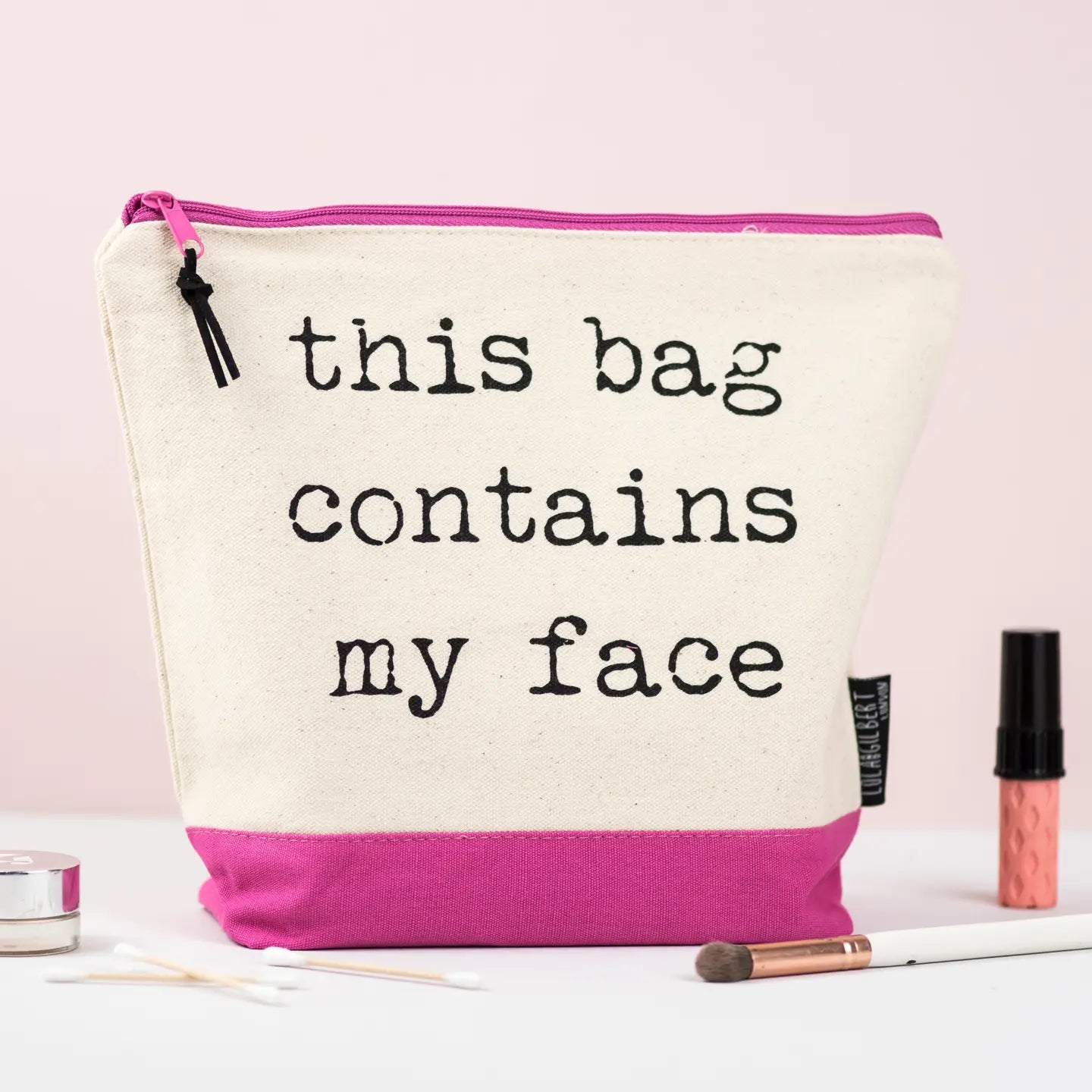 This Bag Contains My Face Washbag in Pink adds personality to your routine. Perfectly sized and durable, it’s ideal for travel or makeup lovers.