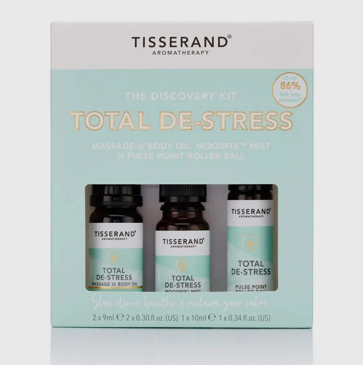Discover tranquility with the Total De-Stress Discovery Kit by Tisserand, featuring essential oils for relaxation and calm. Perfect for a serene daily routine.
