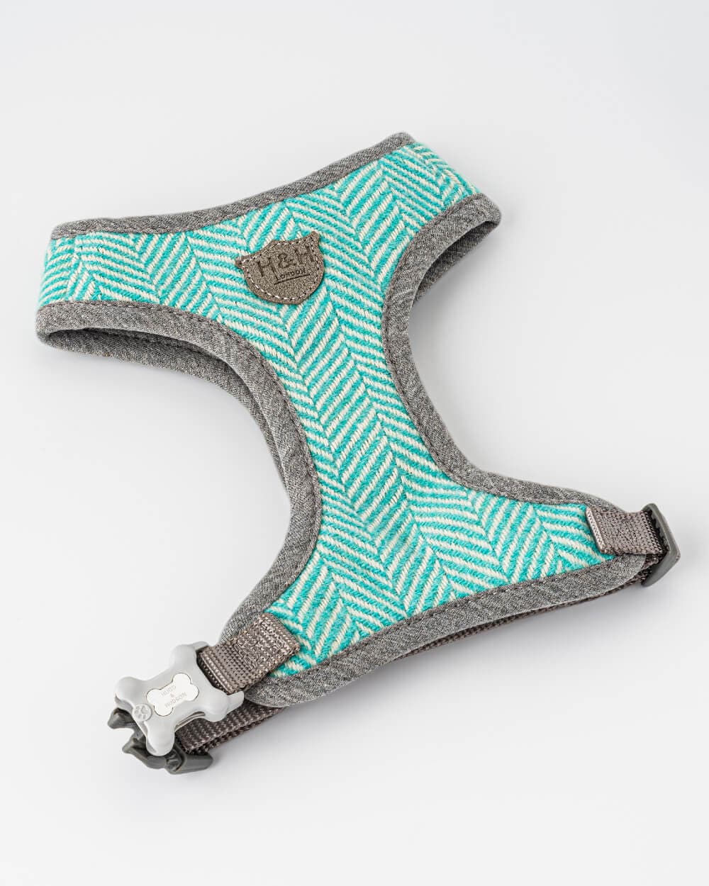 This Aqua Herringbone tweed dog harness is a quintessential British classic in herringbone patterns. It’s made of strong nylon with double-stitched seams and rear buckle, to prevent pulling and reduce pressure on the neck of your pup. Complement this look with the matching dog collar and lead (sold separately). Plus, with 4 sizes to choose from, you’ll be sure to find the perfect fit for your beloved pup.
